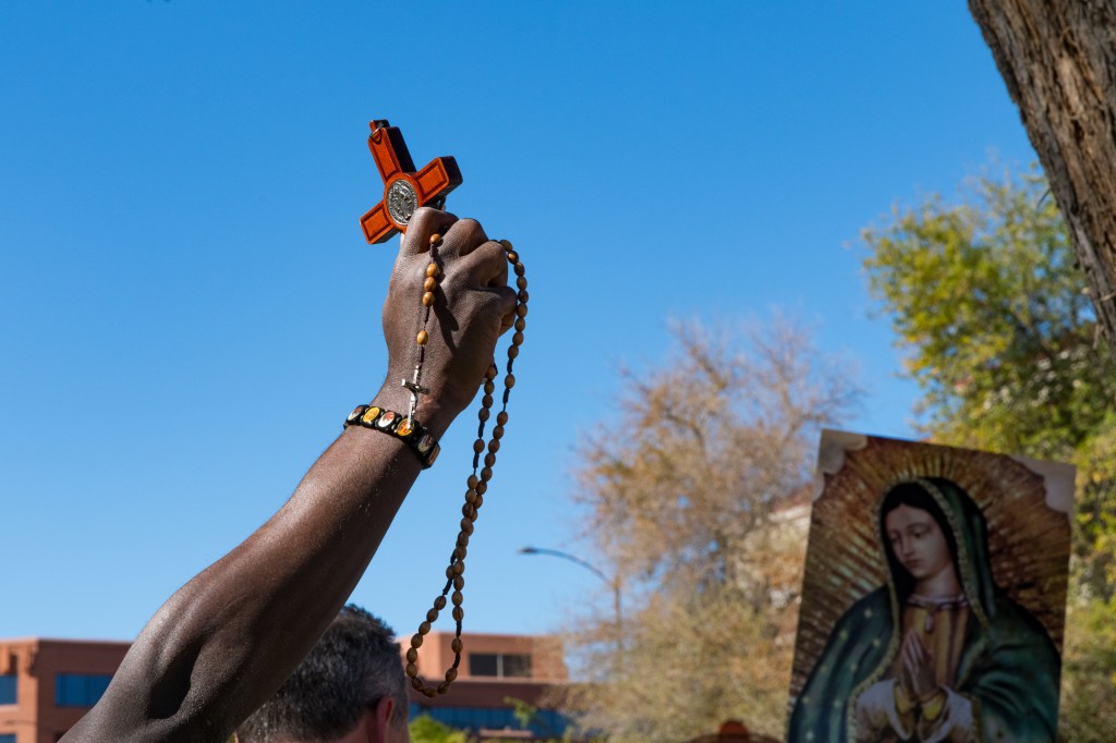 Feb 11, 2022; Scottsdale, Arizona, USA; Catholic protester holds up a crucifix and rosary as they pray outside the Saguaro Hotel, where the The Satanic Temple will host a SatanCon from Feb 11-13 in Old Town Scottsdale. Mandatory Credit: Megan Mendoza-Arizona Republic