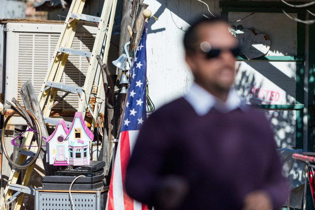 Feb 25, 2022; Phoenix, Arizona, USA; Victor Vidales stands in front of an unkept home in South Phoenix as he references the home while discussing possible infrastructure improvements with community members. Mandatory Credit: Megan Mendoza-Arizona Republic