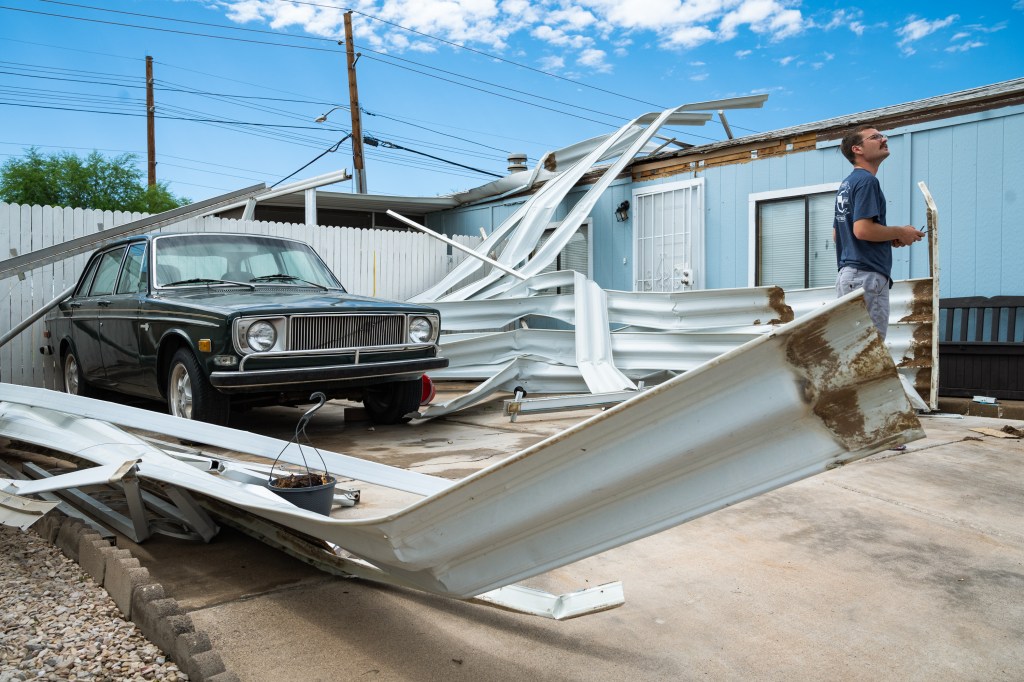 Kenny Nahkala stands in front of his house as he flies a drone the day after a storm brought down the metal awning over his driveway, photographed on Aug. 19, 2022 in Peoria, AZ.