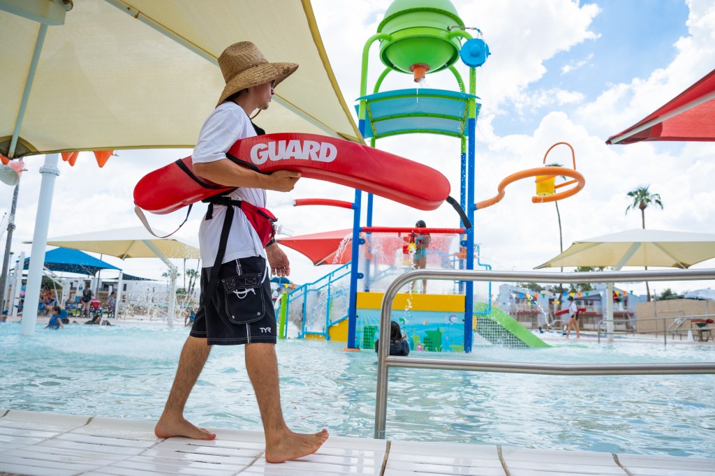 While Phoenix experiences a lifeguard shortage, lifeguard, James Russell, walks along the side of the shallow pool at Cortez Park on Aug. 20, 2022 in Phoenix, AZ.