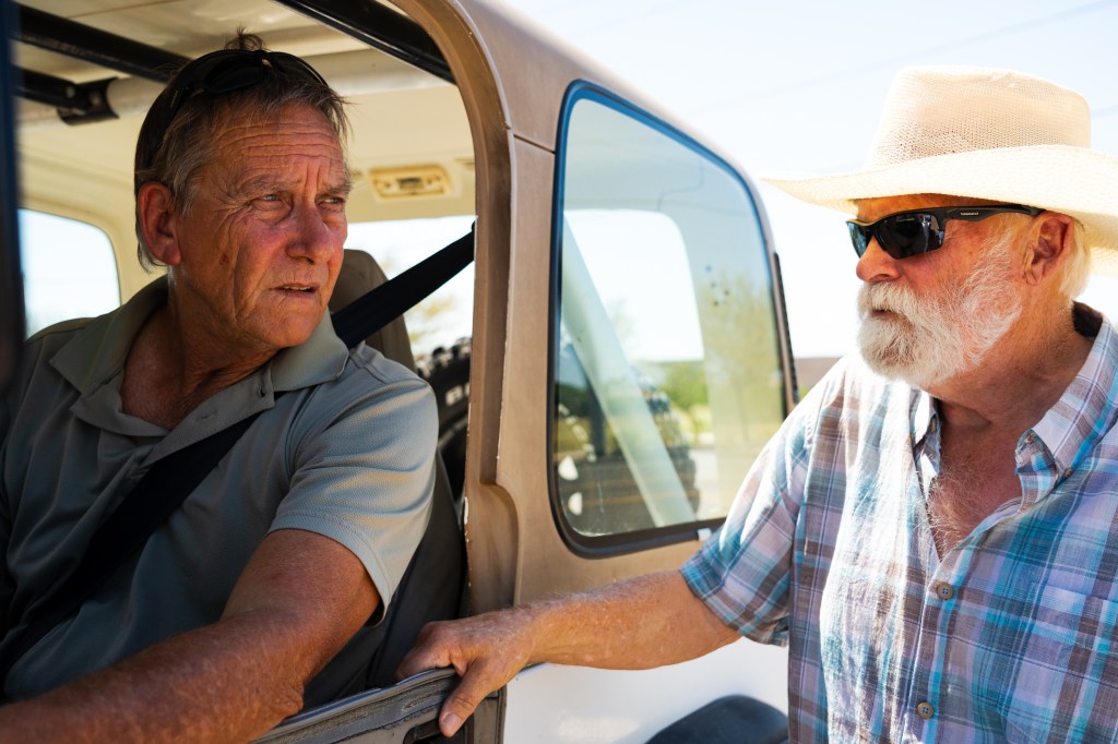 Tom Beranek, left, and Dave Webb, right, wait outside the scene of a shooting that occurred the night before near the intersection of Deer Valley Road and 27th Avenue in North Phoenix, photographed on Aug. 29, 2022 in Phoenix, AZ. Multiple road closures and police investigation have left Tom and Dave unable to return home all day.