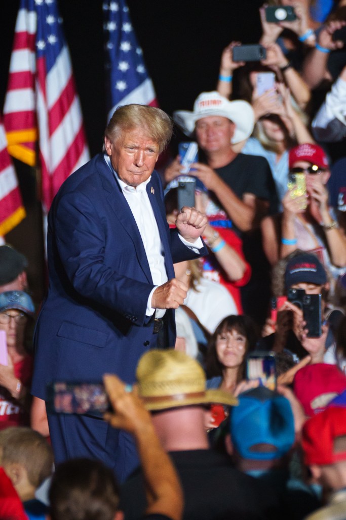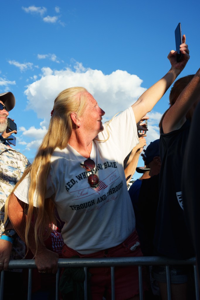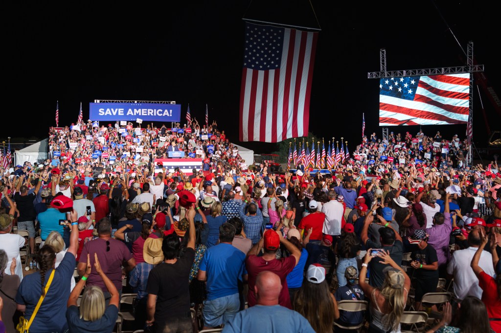 An audience member watches Donald Trump take the stage at a Save America rally at Bell Bank Park on Oct. 9, 2022 in Mesa, AZ.