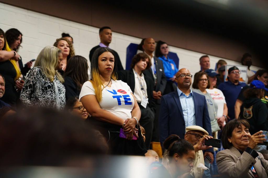 Audience listens to former U.S. President, Barack Obama speak at an Ariz. Democratic campaign rally at Cesar Chavez High School on Nov. 2, 2022 in Phoenix, AZ.