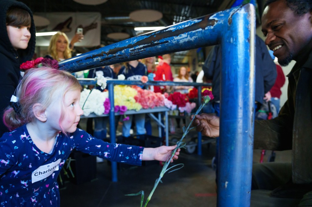 Charolette French, 4, hands out carnations as people arrive for Thanksgiving dinner at a ÒChampions for the HomelessÓ event in the St. Vincent de Paul dining room on Nov. 24, 2022 in Phoenix, AZ.