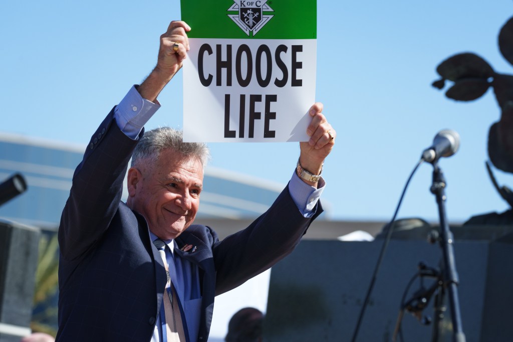State senator Sonny Borrelli runs across the stage holding a Òlove life, choose lifeÓ signvat the Arizona March for Life at Wesley Bolin Plaza on Feb. 23, 2023 in Phoenix, AZ.