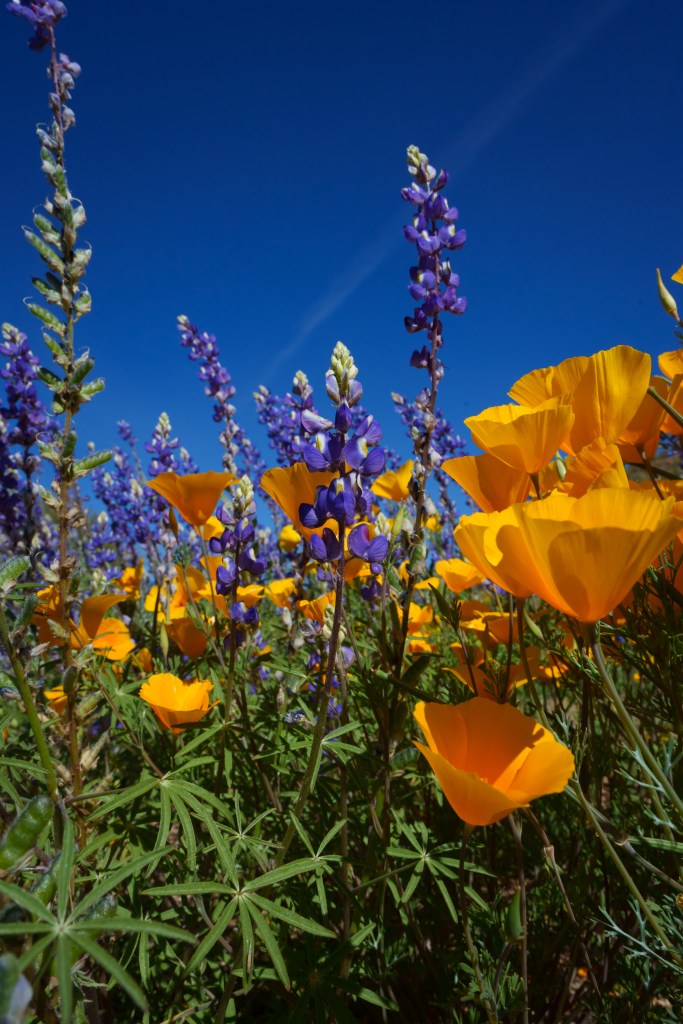 Orange and purple wildflowers grow in Tonto National forest, near Bartlett Lake as Arizona experiences a super bloom on April 9, 2023 in Rio Verde AZ.