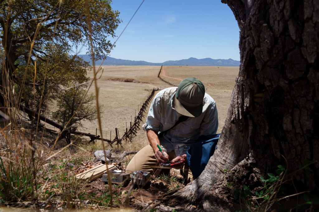 Sky Island AllianceÕs Wildlife Project Manager, Eamon Harrity collects data from a wildlife camera on a hill overlooking the U.S.-Mexico border in the San Rafael Valley, east of Nogales, Ariz. on April 27, 2023. The camera is used to capture animal movement and provide data to assess how the different physical barriers along the border affect wildlife movement and biodiversity.