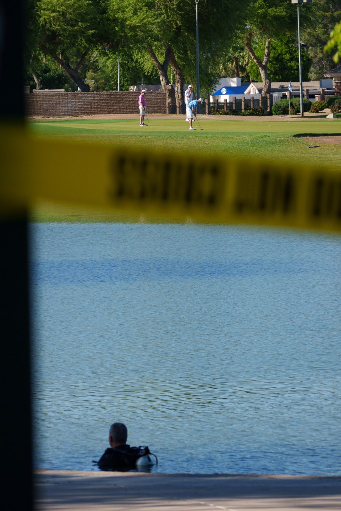 The Maricopa County Sheriffs office conducts a water search and rescue in the lake at Dobson Ranch Park as people golf at a nearby course on May 6, 2023 in Mesa, AZ.
