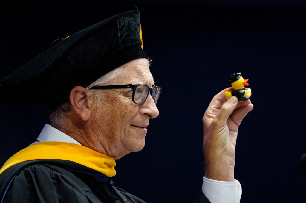 Bill Gates holds up a graduation-themed rubber duck as he speaks at Northern Arizona University’s Spring 2023 commencement at the NAU Skydome on May 13, 2023 in Flagstaff, AZ.