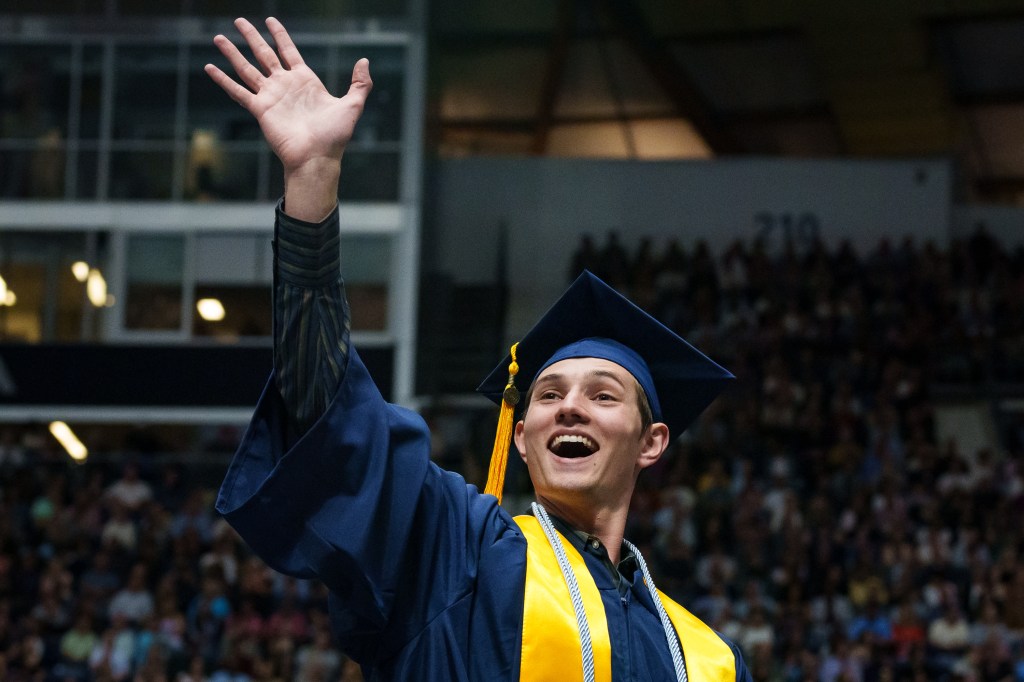 ‘A Northern Arizona University graduate waves to the crowd during NAUs Spring 2023 commencement at the NAU Skydome on May 13, 2023 in Flagstaff, AZ.