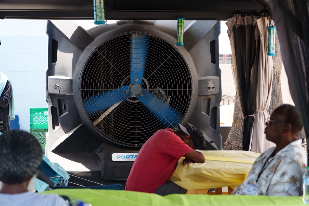 People sit in the shade, under awnings as a large, industrial fan blows outside Justa Center, during excessive heat warnings on July 16, 2023 in Phoenix, AZ.