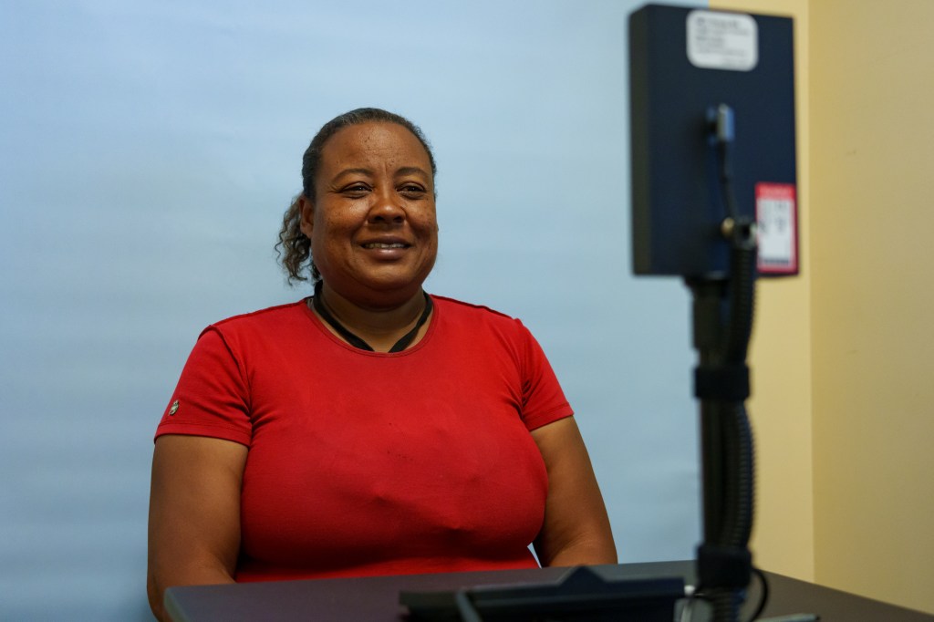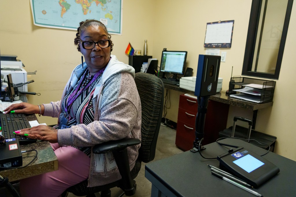 Motor Vehicle Department customer service representative, Imogene Barnes helps unhoused people receive identification documents at the Brian Garcia Welcome Center at the Human Services Campus on August 7, 2023, in Phoenix, AZ.
