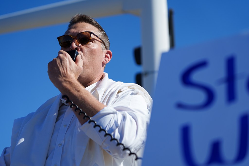Rabbi Shmuly Yanklowitz uses a megaphone as he speaks to the protesters that join him on the corner of Scottsdale Road and Thunderbird Road in support of Israel and to call for the release of hostages on October 15, 2023, in Scottsdale, AZ.