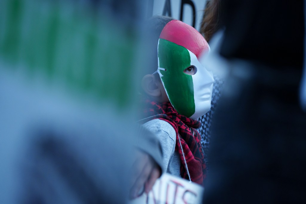 A young attendee wears a Palestinian flag mask over their face in a crowd of protestors at Tempe City Hall during the All Out for Palestine Rally on Dec. 10, 2023, in Tempe, AZ.