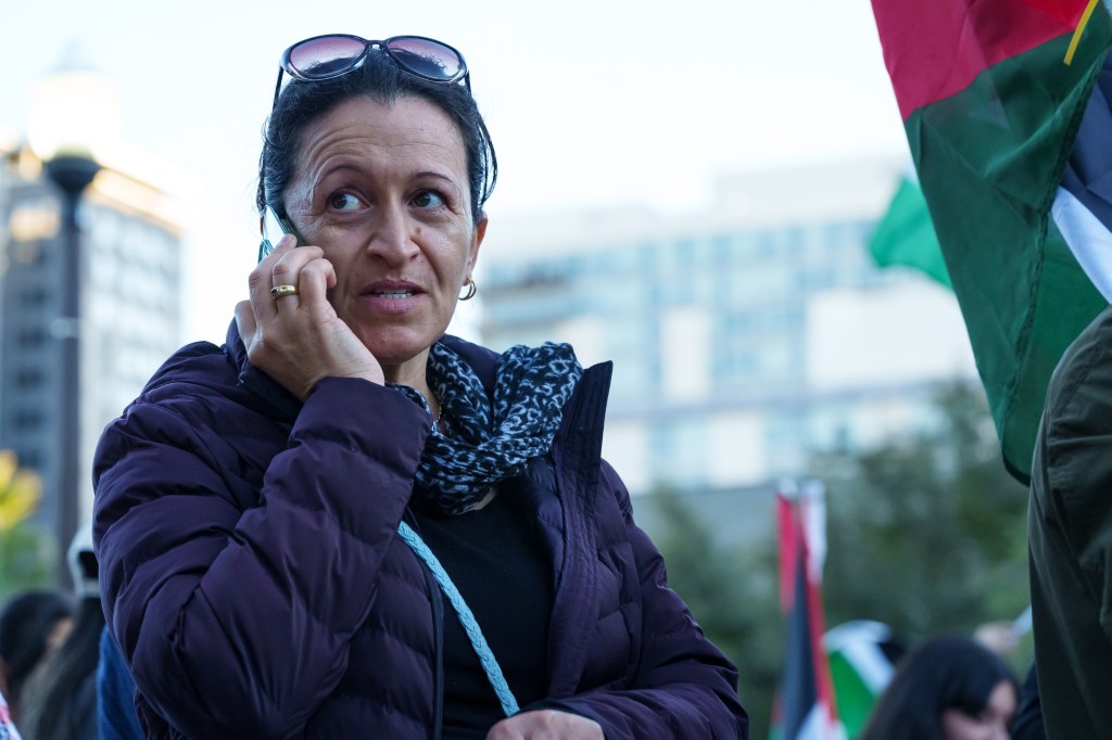 Katia Lekmine uses her phone to call the office of Sen. Mark Kelly during the All Out for Palestine Rally at Tempe City Hall on Dec. 10, 2023, in Tempe, AZ. The crowd of protesters call all at once, leaving messages, asking for a ceasefire.