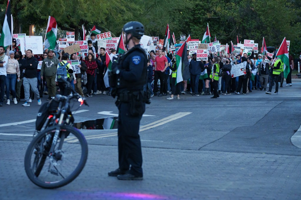Protestors travel towards Mill Avenue on Sixth street as they march for the All Out for Palestine Rally on Dec. 10, 2023, in Tempe, AZ.