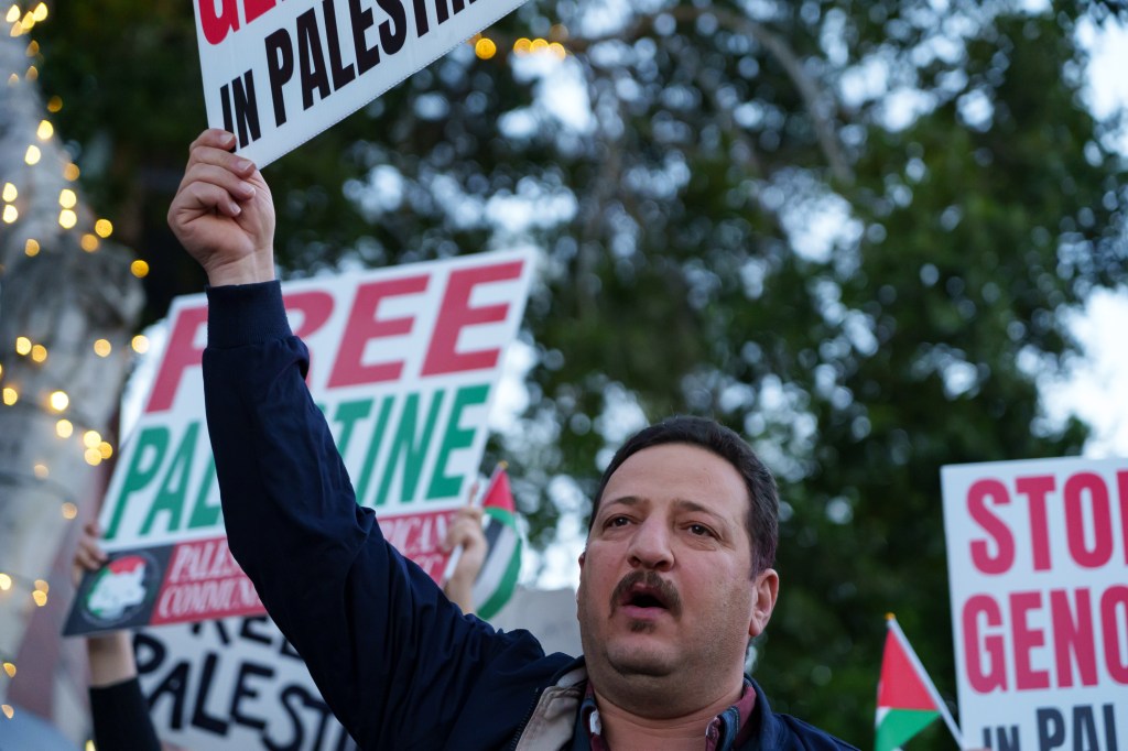 Layth Aljanbi marches along Mill Avenue for the All Out for Palestine Rally on Dec. 10, 2023, in Tempe, AZ.