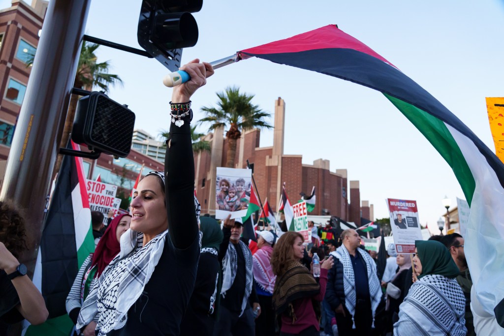 Protestors gather at Tempe City Hall for the All Out for Palestine Rally on Dec. 10, 2023, in Tempe, AZ. They call for an immediate, permanent ceasefire in Gaza and aim to bring attention to Gazan suffering.