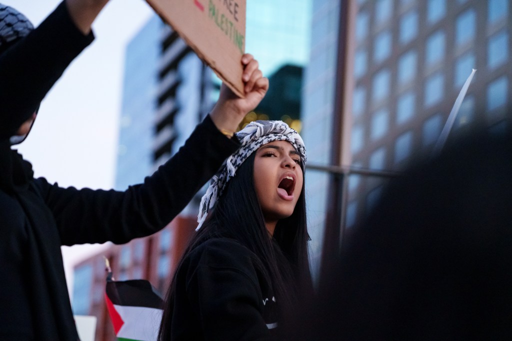 Tala Saleh shouts with the crowd of protestors at the corner of Mill Avenue and University Drive during the All Out for Palestine Rally and March on Dec. 10, 2023, in Tempe, AZ.