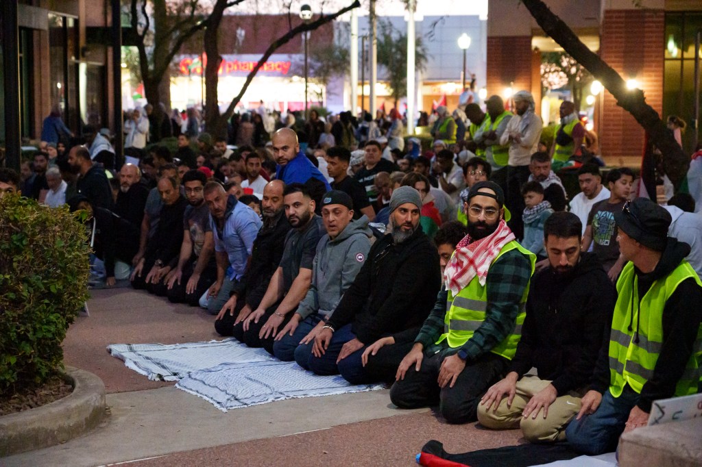 A group of protestors step away from the crowds to pray during the All Out for Palestine Rally and March at the corner of Mill Avenue and University Drive on Dec. 10, 2023, in Tempe, AZ.