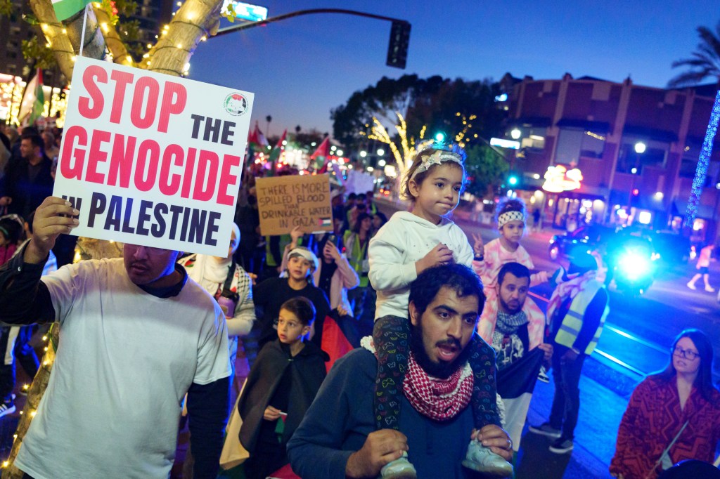 Protestors march along Mill Avenue for the All Out for Palestine Rally on Dec. 10, 2023, in Tempe, AZ. They call for an immediate, permanent ceasefire in Gaza and aim to bring attention to Gazan suffering.