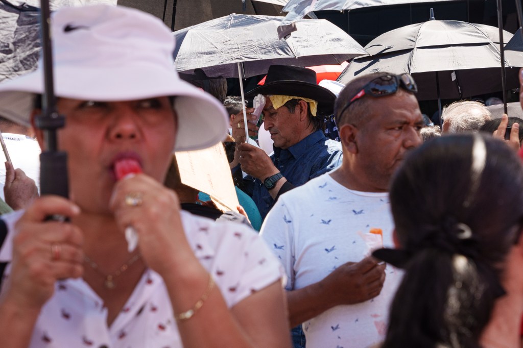 Rafael Mancilla holds a car sun shade over his head as he wait outside the Mexican Consulate in Phoenix, Ariz. to vote on Mexico’s Election Day on June 2, 2024 in Phoenix, Ariz.
