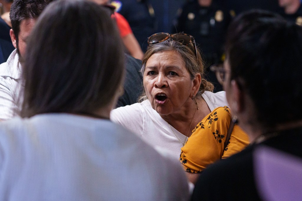 Maria Esquiuel argues with an election worker after the polls close, leaving crowds of people in line at the Mexican Consulate in Phoenix, Ariz. unable to vote on Mexico’s Election Day on June 2, 2024 in Phoenix, Ariz. Maria had been waiting in line since 7am.