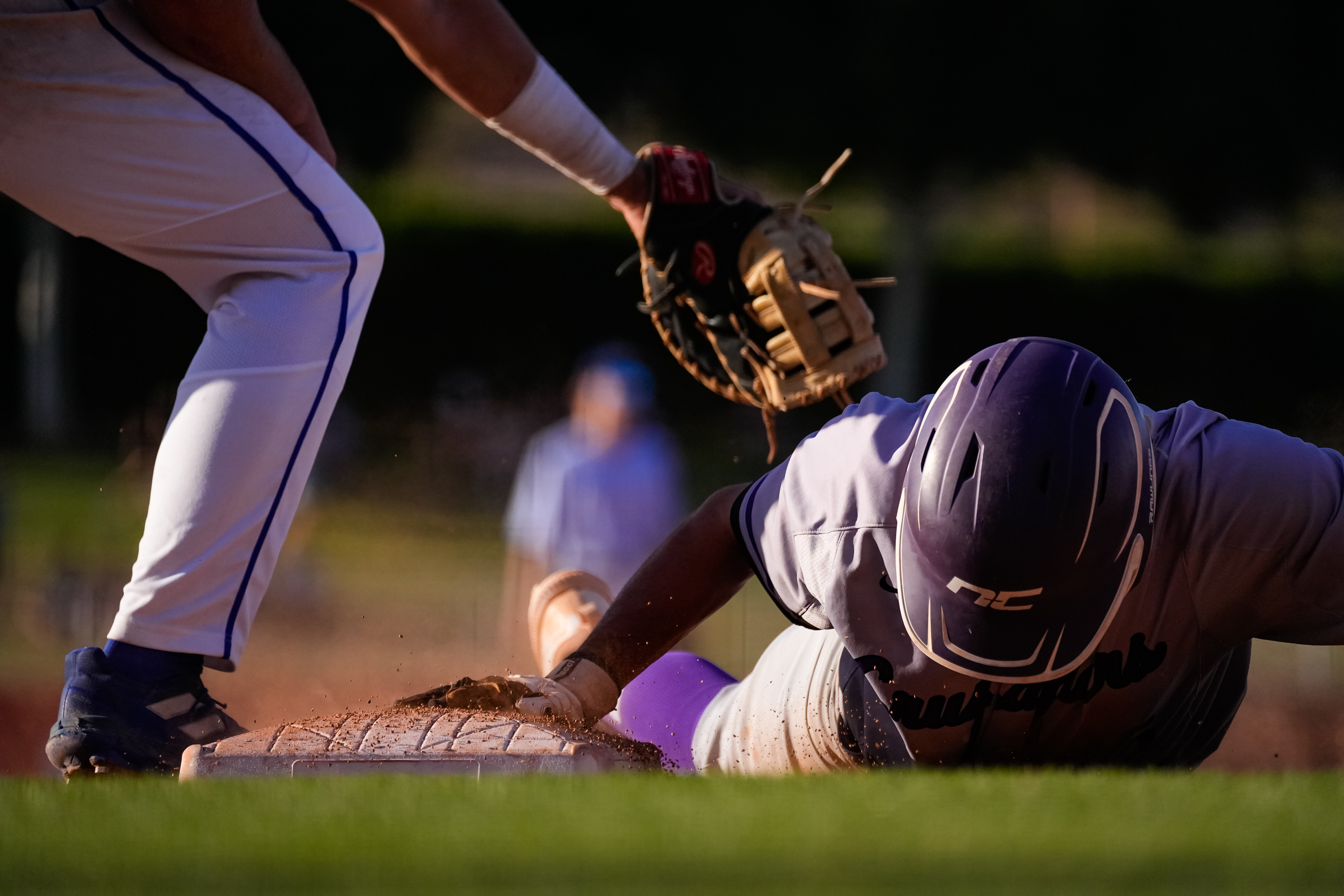 During a pick off attempt, first baseman, Hunter Heeringa (5) of Valley Christian reaches for Zach Veilleux (16) as he dives at the 3A Baseball State Championship at Tempe Diablo Stadium on May 15, 2023 in Tempe, AZ.