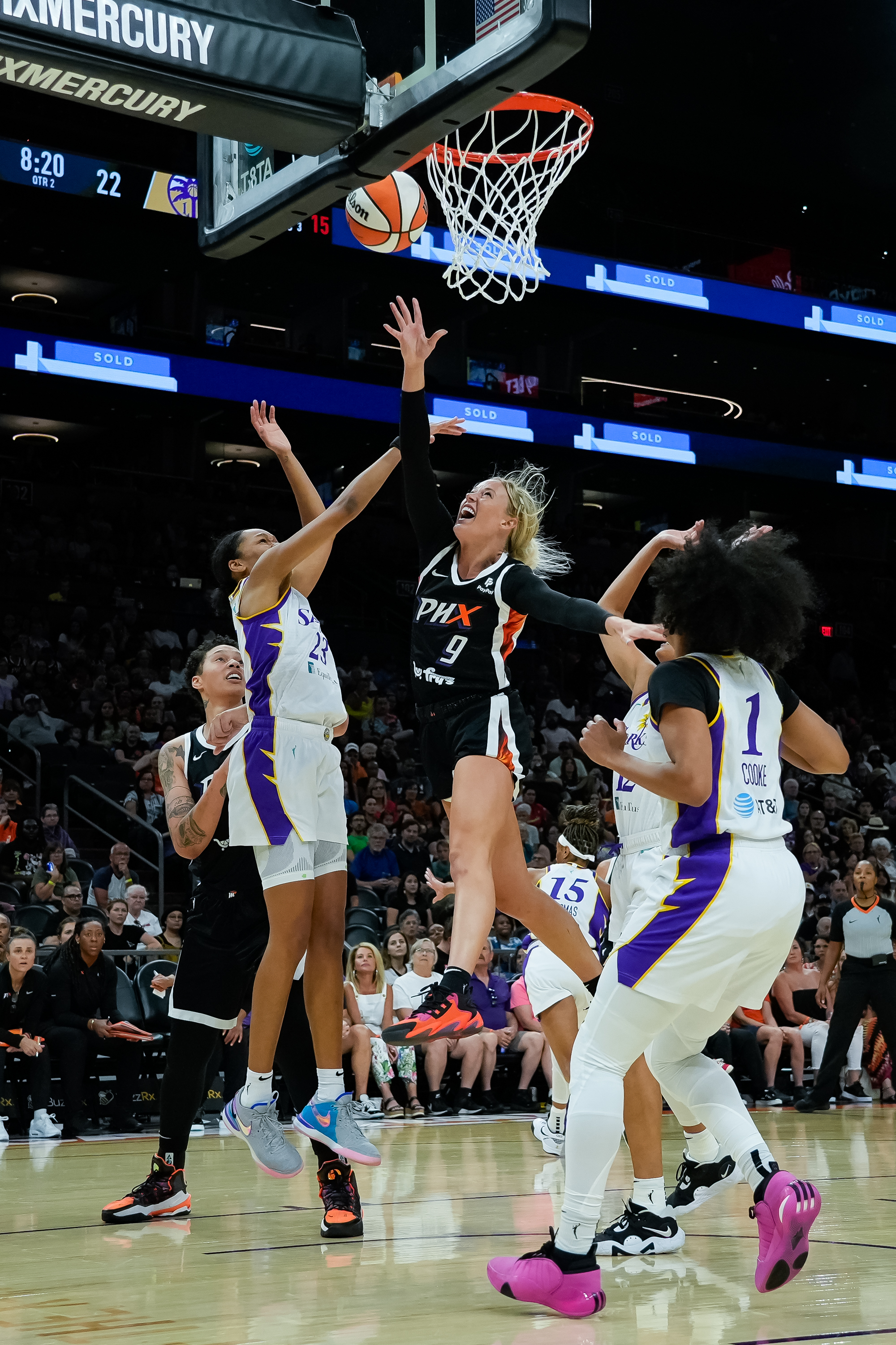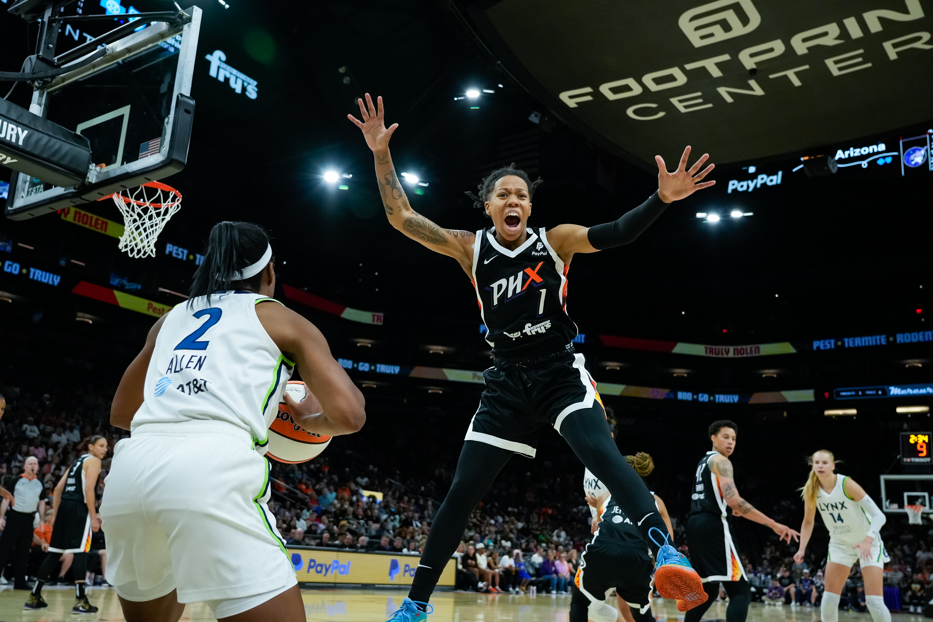 Sug Sutton (1) of the Phoenix Mercury jumps and shouts as she guards Lindsay Allen (2) of the Minnesota Lynx during a game at the Footprint Center on July 1, 2023 in Phoenix, AZ.