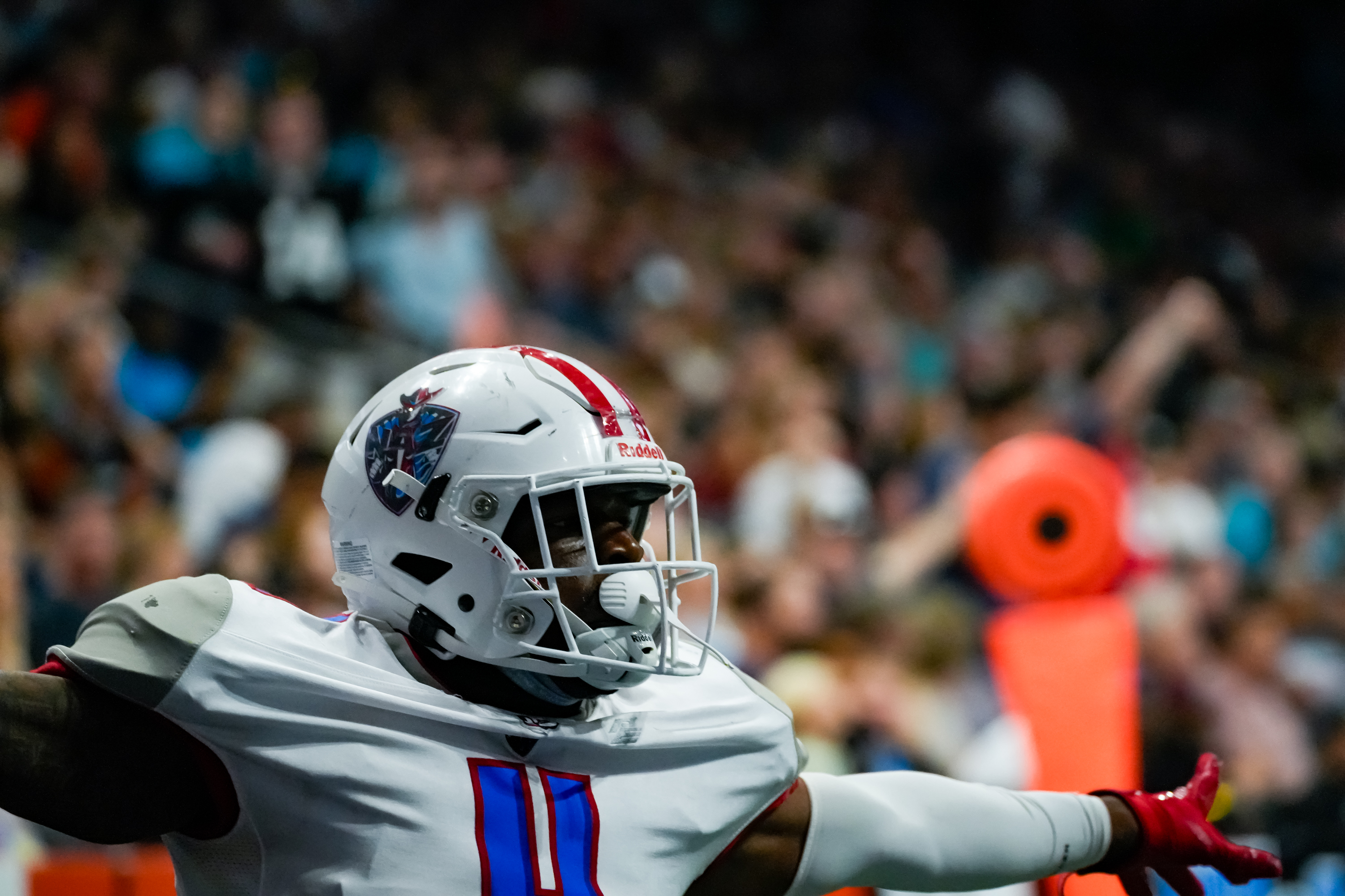 Jacob Moss (11) of the Northern Arizona Wranglers celebrates during the Wranglers game against the Arizona Rattlers at the Footprint Center on July 15, 2023 in Phoenix, AZ.