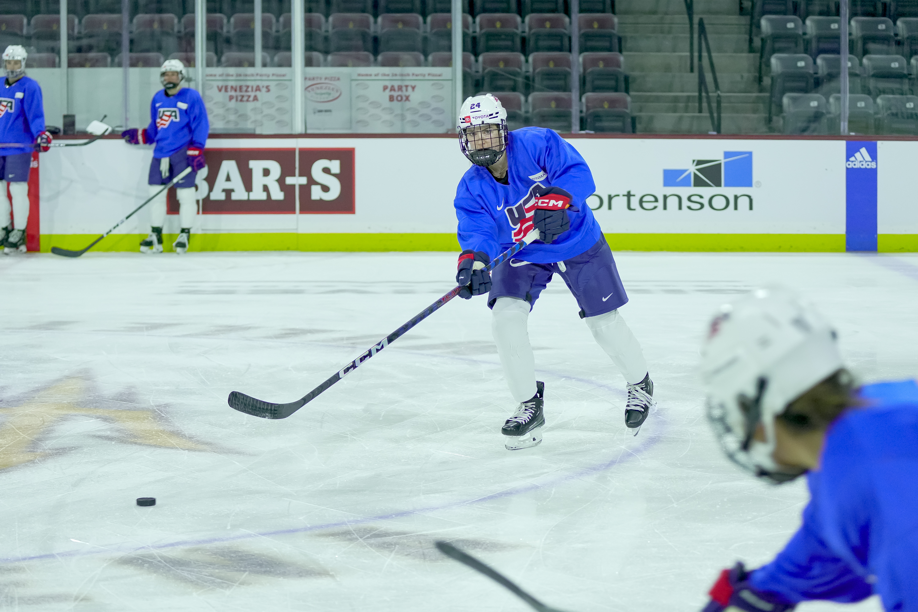 Natalie Buchbinder (24) passes the puck to a teammate as she practices with Team USA at Mullett Arena on Nov. 6, 2023, in Tempe, AZ.