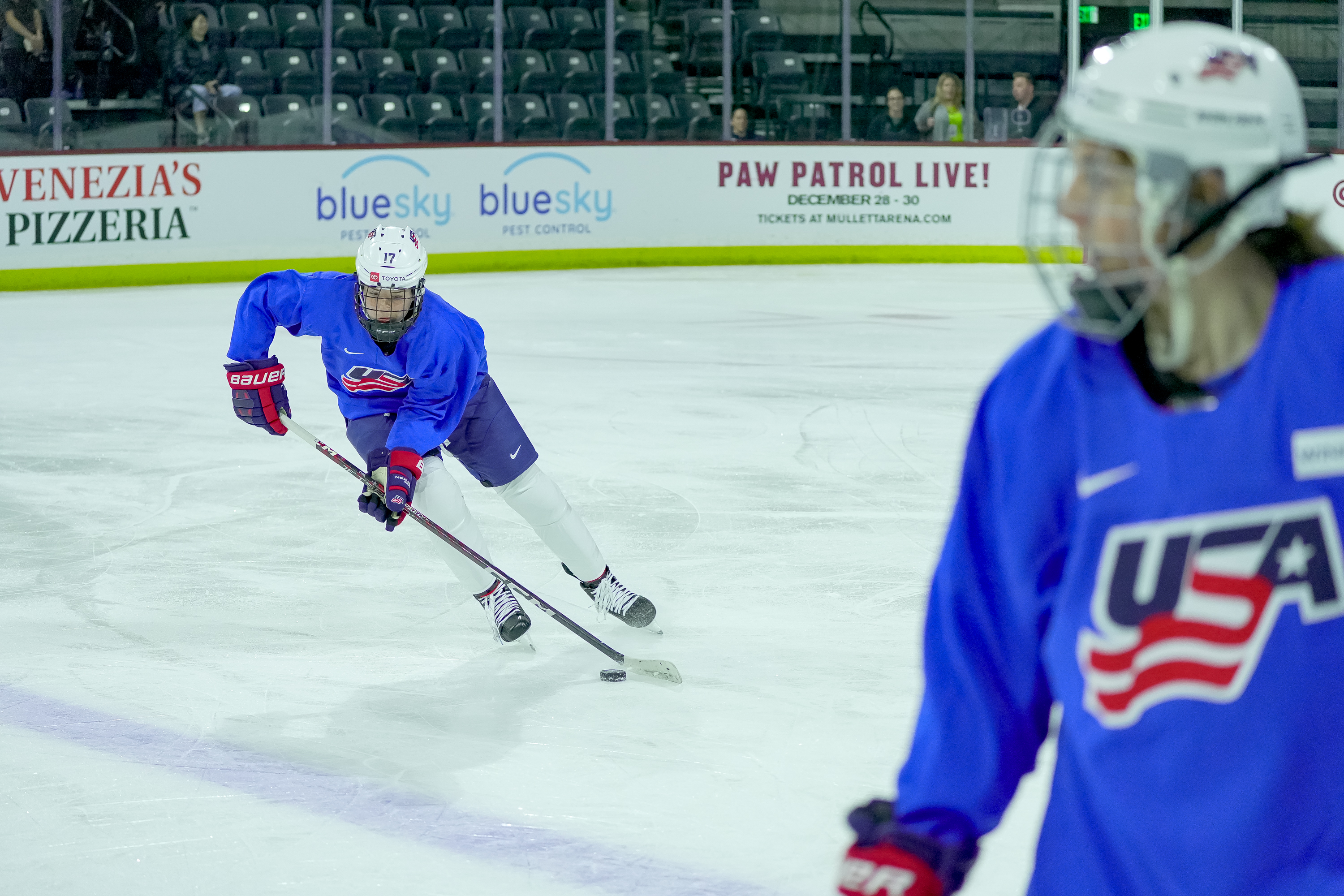 Britta Curl (17) moves the puck as she practices with Team USA at Mullett Arena on Nov. 6, 2023, in Tempe, AZ.