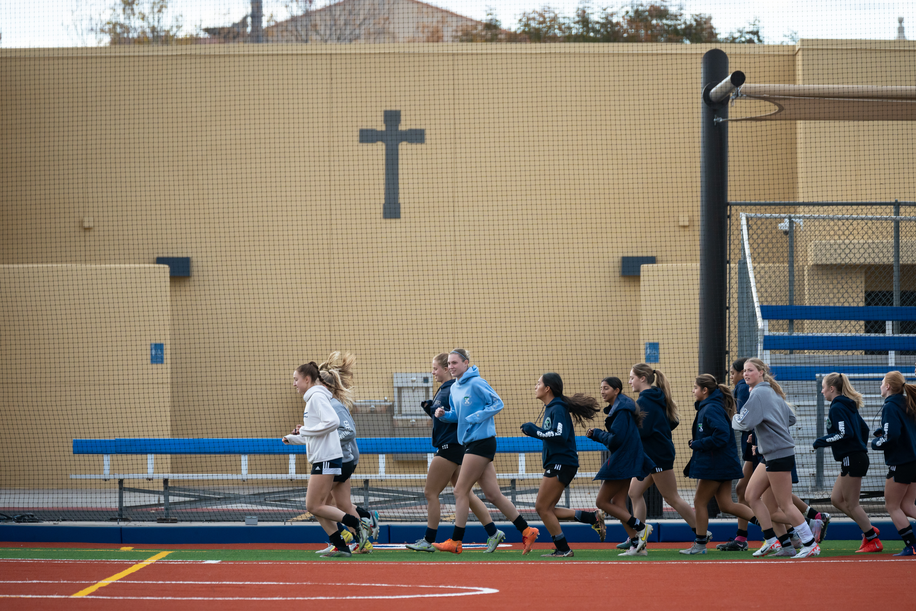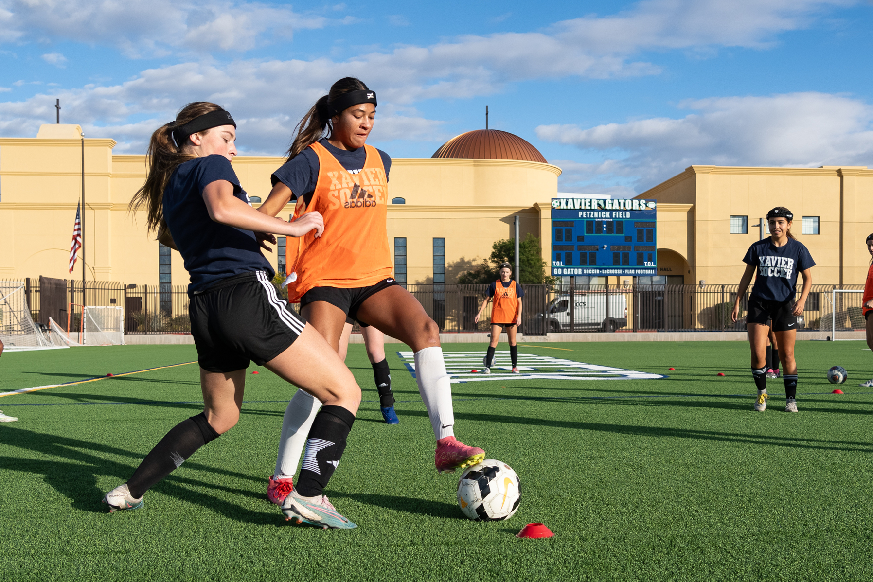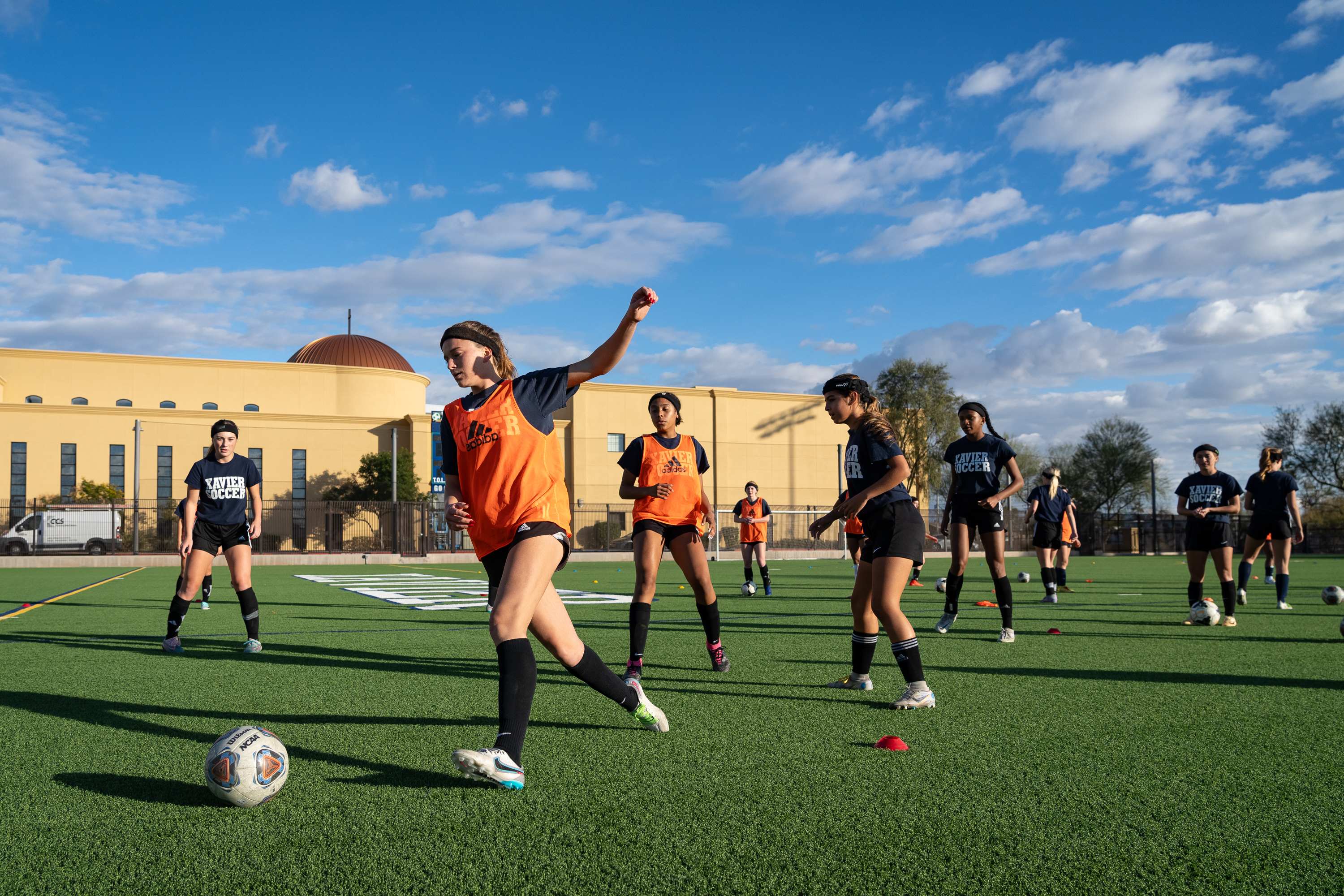 Lucy Brink (front) goes after the ball during varsity soccer practice at Xavier College Preparatory on Jan. 4, 2024, in Phoenix, AZ.